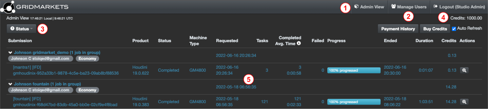 List of user submissions – select the (magnifying glass) button to view the frames and their logs, or the button to stop the job